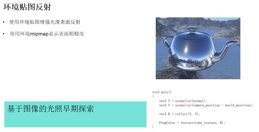 为了模拟金属等光滑表面的镜面反射效果,即让其能映照出周围环境,图形学中常使用环境贴图技术。该技术将整个环境的光照信息预先烘焙在一张立方体贴图中。在着色计算时,只需根据表面的反射方向对这张贴图进行采样,即可高效地获取环境入射光,从而呈现出逼真的反射效果。