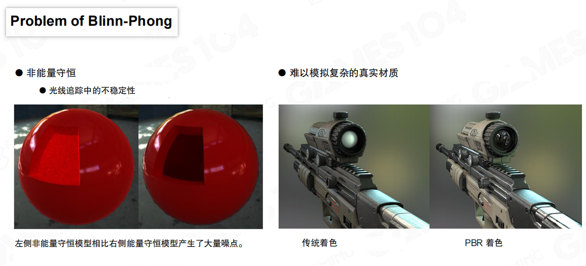 虽然 Blinn-Phong 模型简单高效,但它存在能量不守恒的问题(射入<射出),如果需要做多次漫反射计算时,迭代的颜色可能会越来越亮(不收敛)。而且在光线追踪中表现不稳定,难以模拟复杂的真实材质。