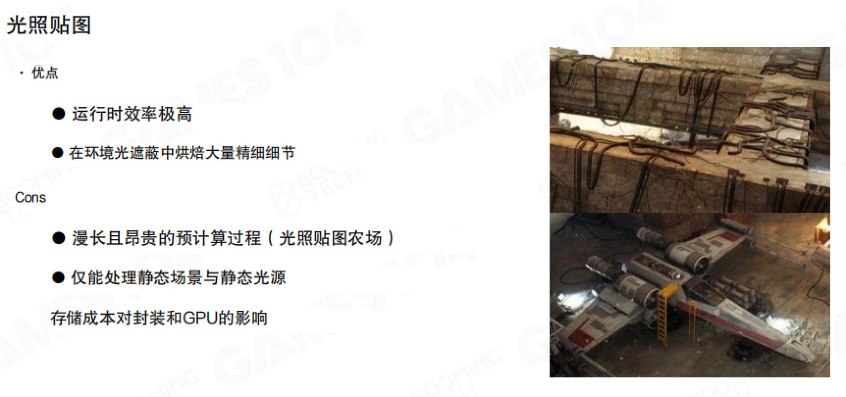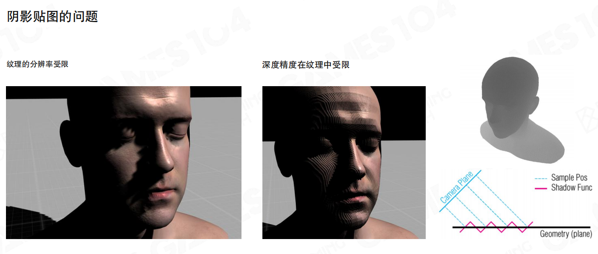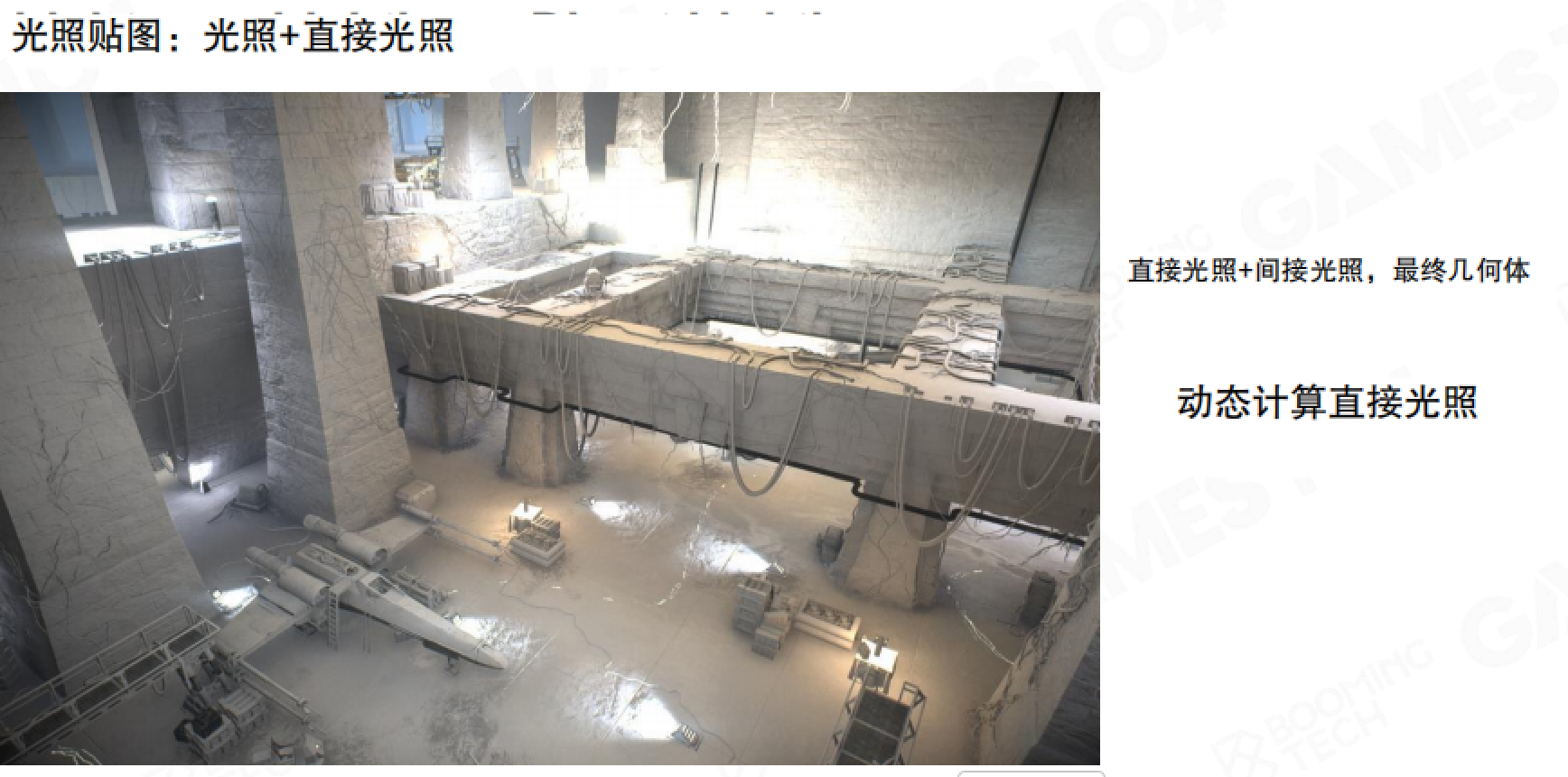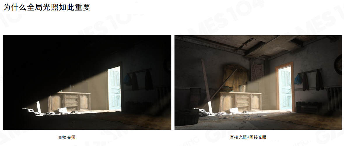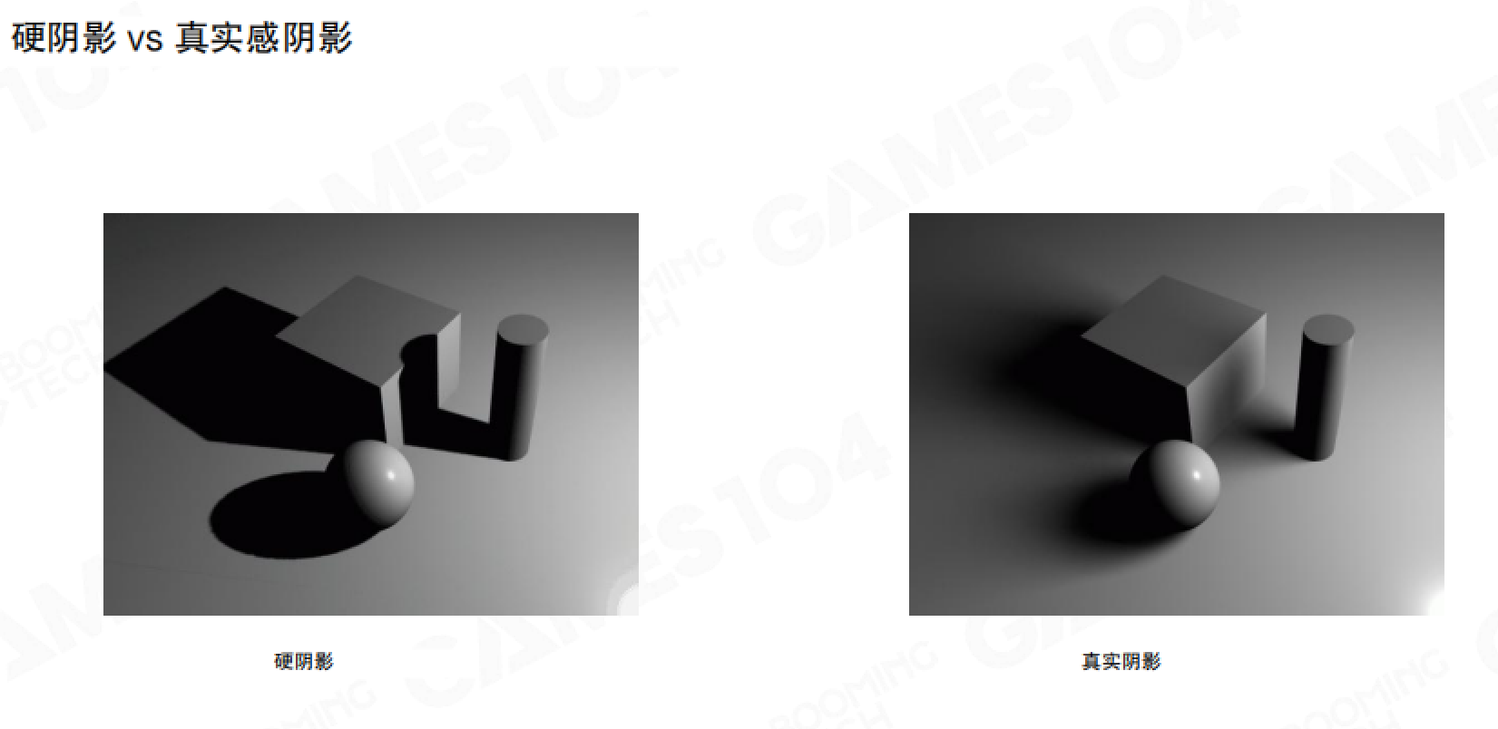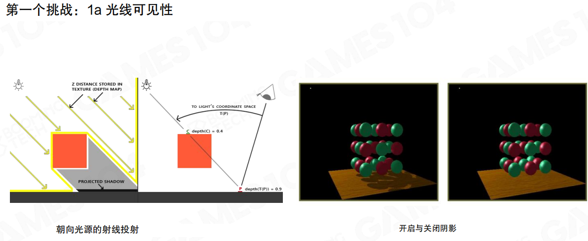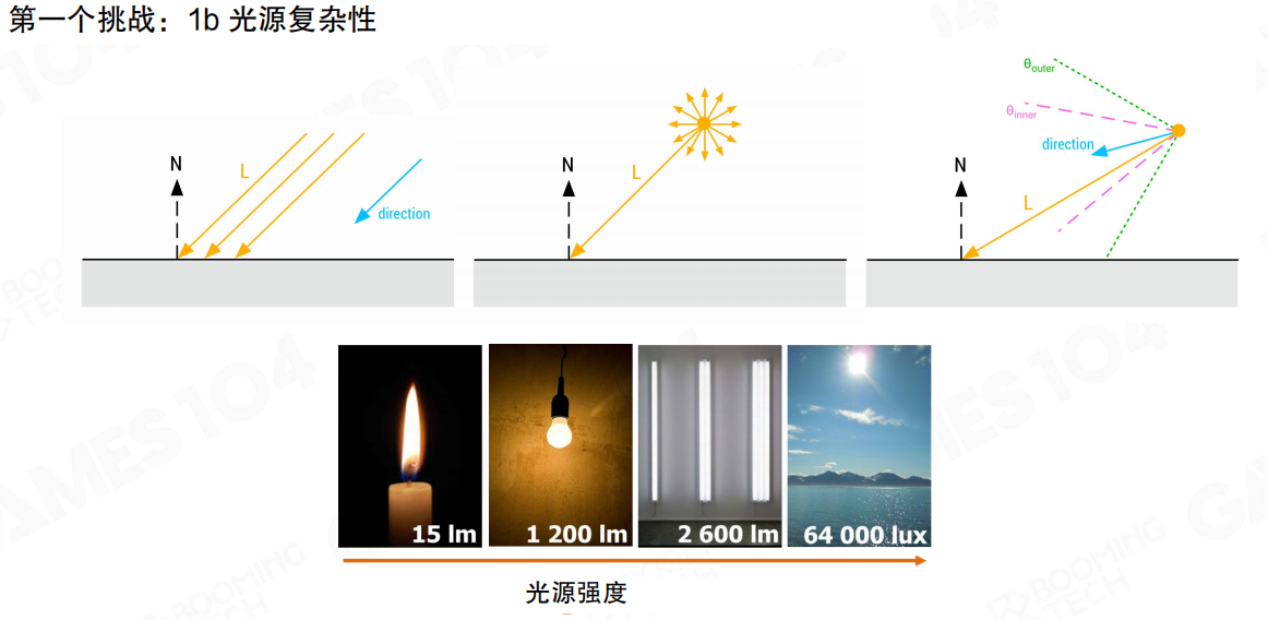 - 第一个挑战:准确判断哪些区域被遮挡,无法接收直接光照以及可能产生的阴影。同时还要高效处理各种类型的光源(平行光、点光源、聚光灯、面光源)