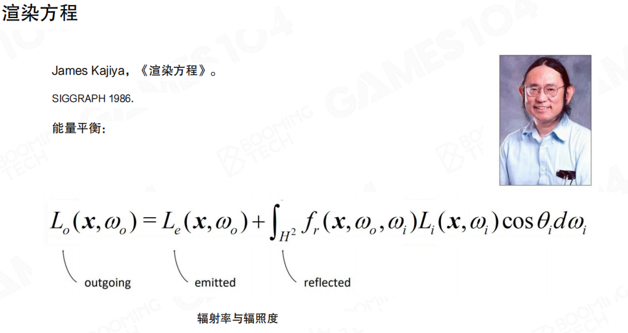 1986年,James Kajiya提出了著名的渲染方程(The Rendering Equation),这一方程成为了整个计算机图形学领域的理论基础: