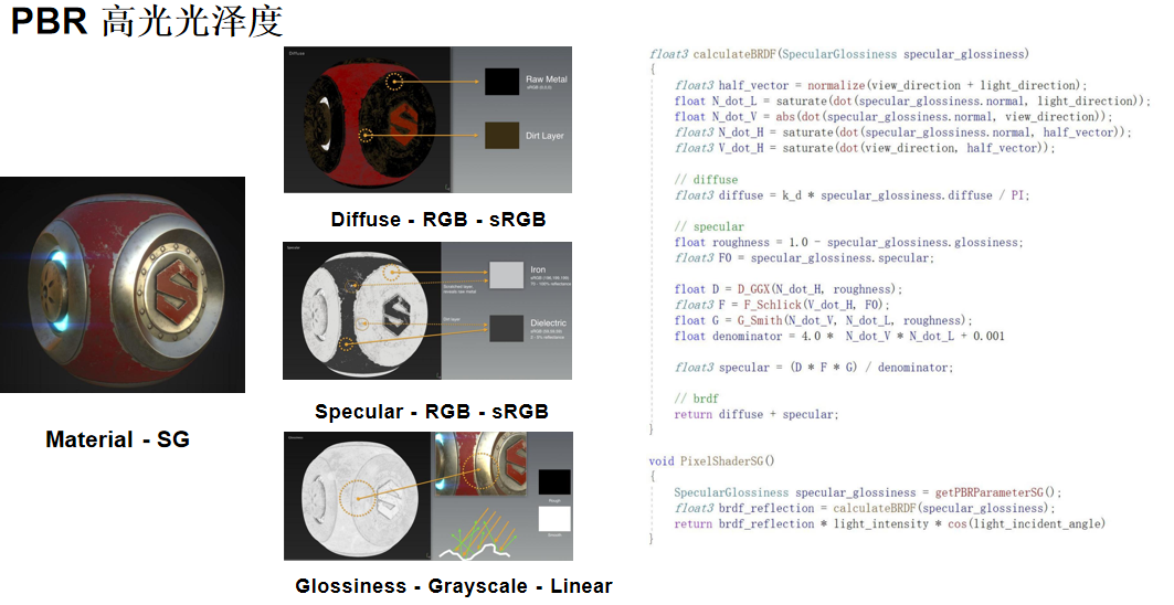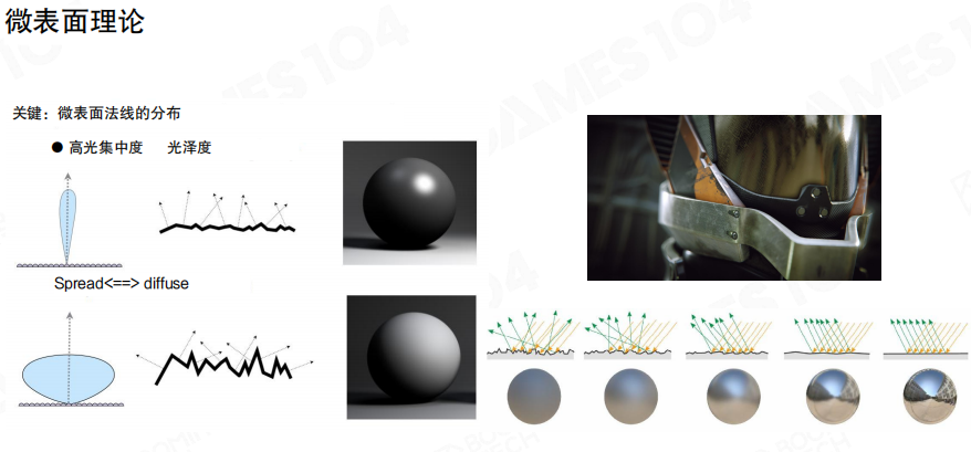 | $\cosθ_i$ | Angle between incoming direction and normal | 余弦项:$θ_i$ 是入射光与法线的夹角。$\cosθ_i$ 模拟了光线倾斜照射时能量衰减的几何关系(即“斜射照度低”)。 |