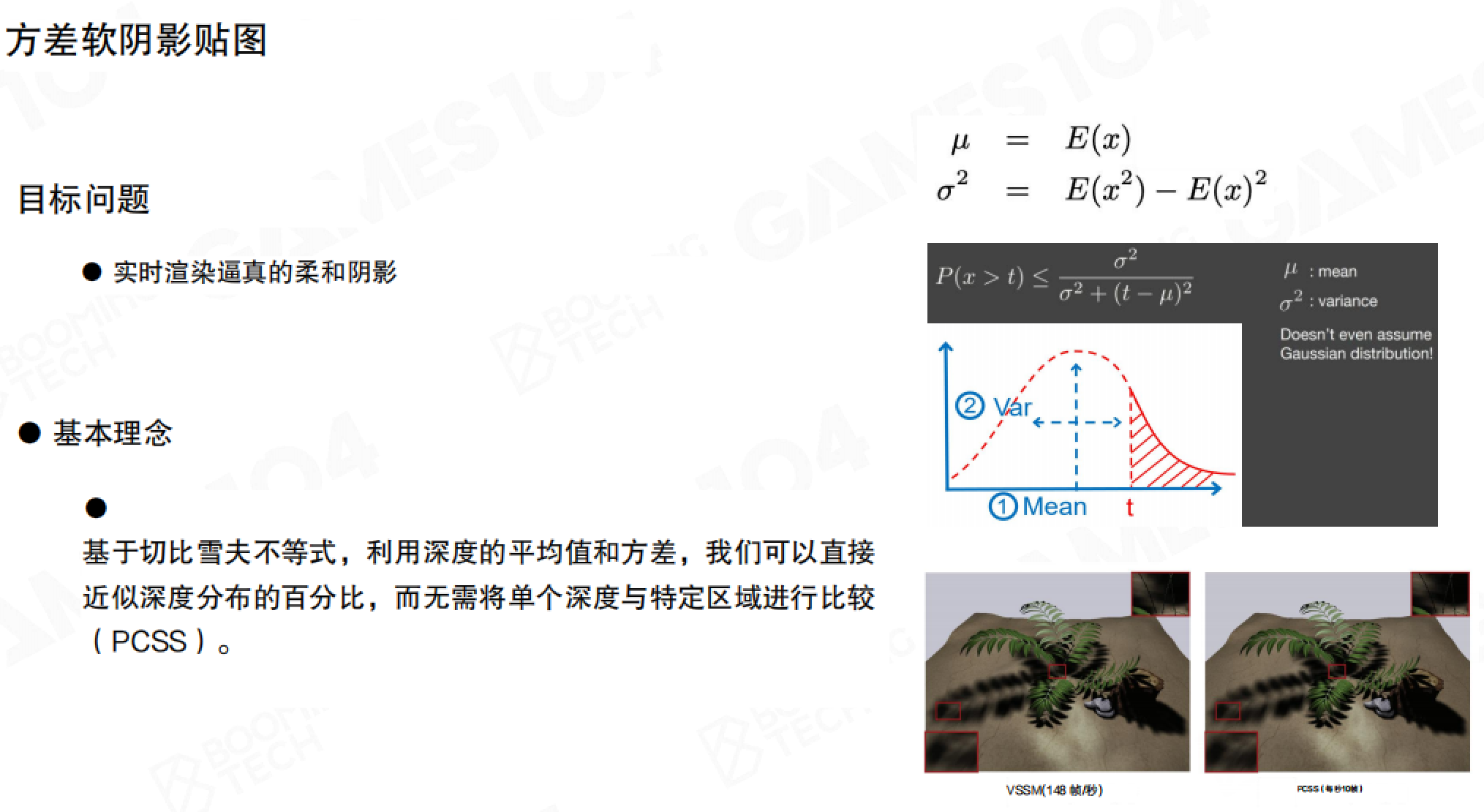 VSSM(Variance Soft Shadow Mapping)是一种高效的软阴影近似方法,它基于切比雪夫不等式(Chebyshev’s Inequality)来估计像素上的阴影比例,避免了PCSS中大量的搜索和采样操作。
