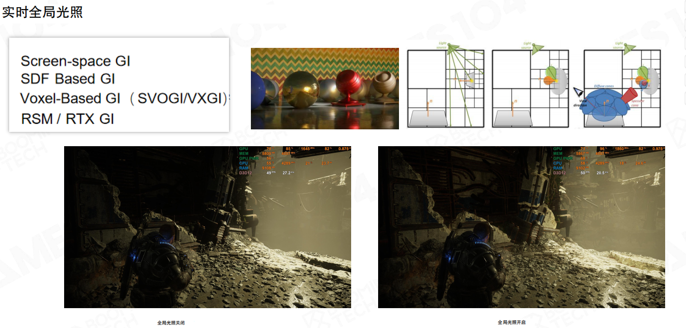 - Screen-space GI:基于屏幕空间信息的全局光照,计算快速但受限于屏幕可见区域
