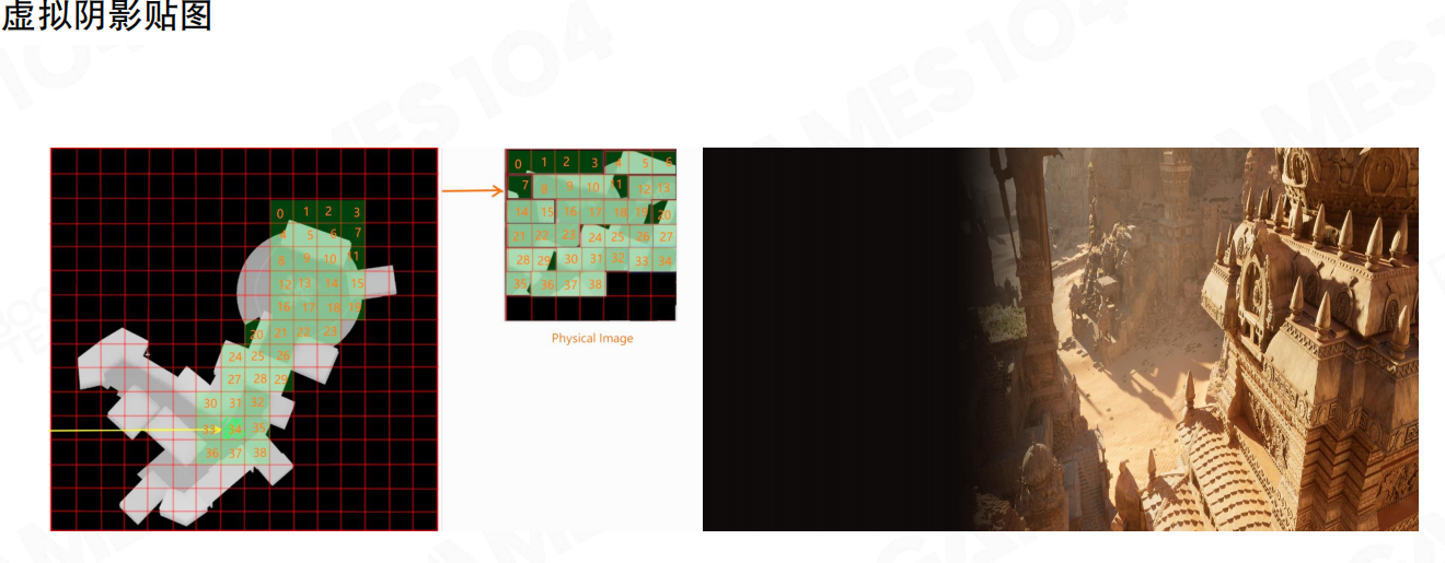 虚拟阴影贴图首先计算场景中哪些区域需要阴影贴图,然后在虚拟的阴影贴图空间中为这些区域分配空间。每个小块生成独立的阴影贴图,这些阴影贴图被打包(Packed)到一个物理纹理中。在计算阴影时,通过反向查找来获取对应小块的数据。
