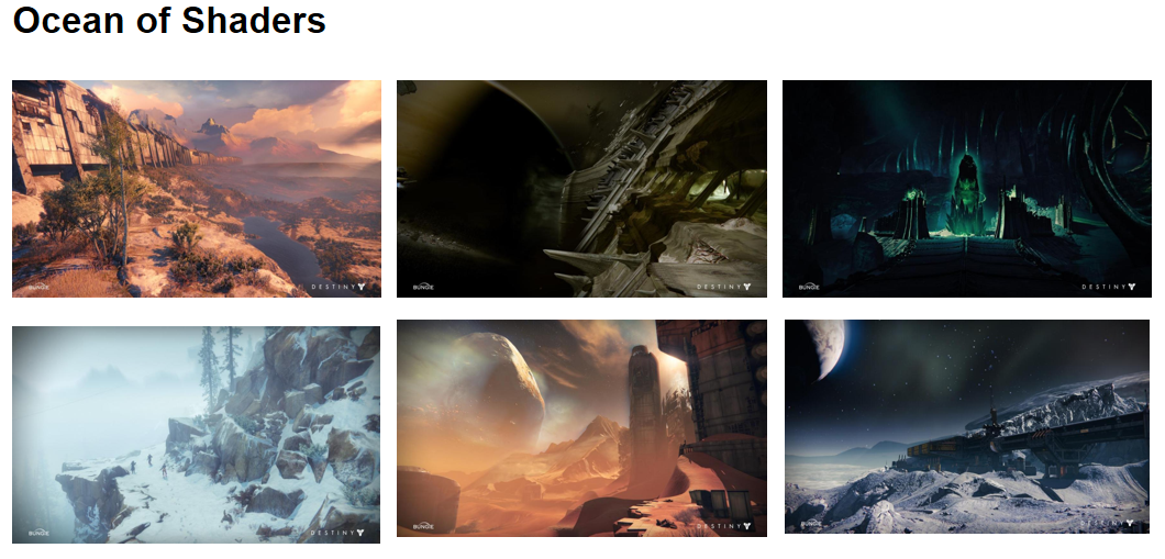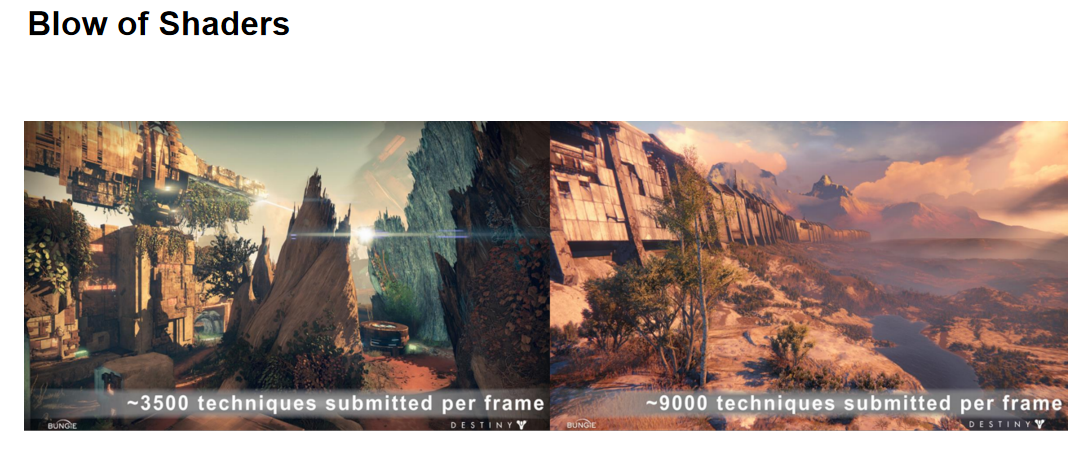 现代游戏中的shader数量庞大。以《命运(Destiny)》为例,游戏中的各种环境场景都需要大量的shader来渲染。