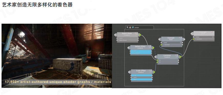 现代游戏引擎提供了强大的可视化shader编辑工具。艺术家可以通过节点编辑器创建各种独特的shader图和材质,而无需直接编写shader代码。在一个真实的游戏项目中,艺术家可能创作了17,800+个独特的shader图和材质。
