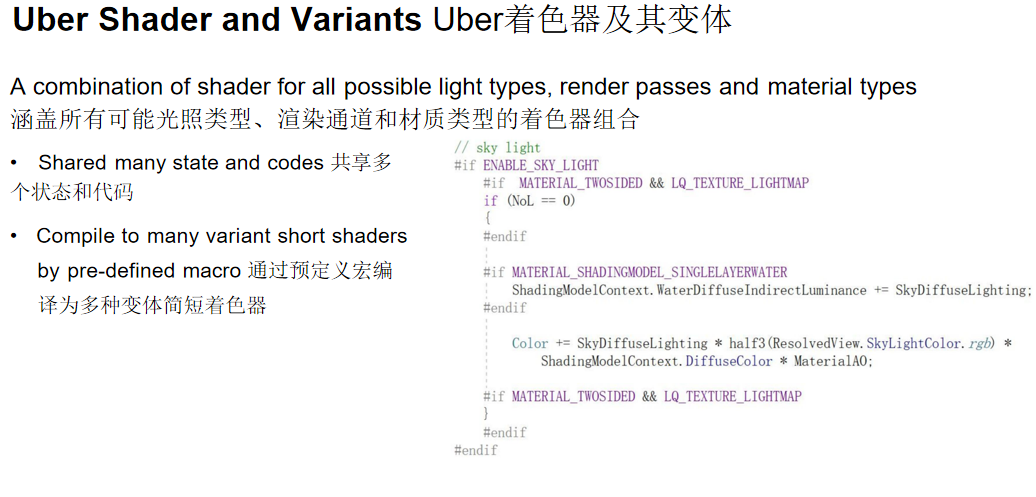 面对如此庞大的shader数量,如果为每种可能的组合都单独编写shader,工作量将是不可想象的。现代游戏引擎采用了Uber Shader(超级着色器)的概念:一个组合了所有可能的光照类型、渲染通道和材质类型的综合shader,通过预定义的宏在编译时生成大量独立的shader变体。