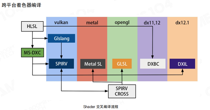 编译流程包括:直接编译(HLSL → SPIRV/DXBC/DXIL)和交叉编译(通过SPIRV CROSS将SPIRV转换为Metal SL、GLSL等)。