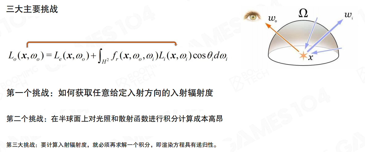 - 第二个挑战:在半球面上对光照和散射函数进行积分的计算成本高昂