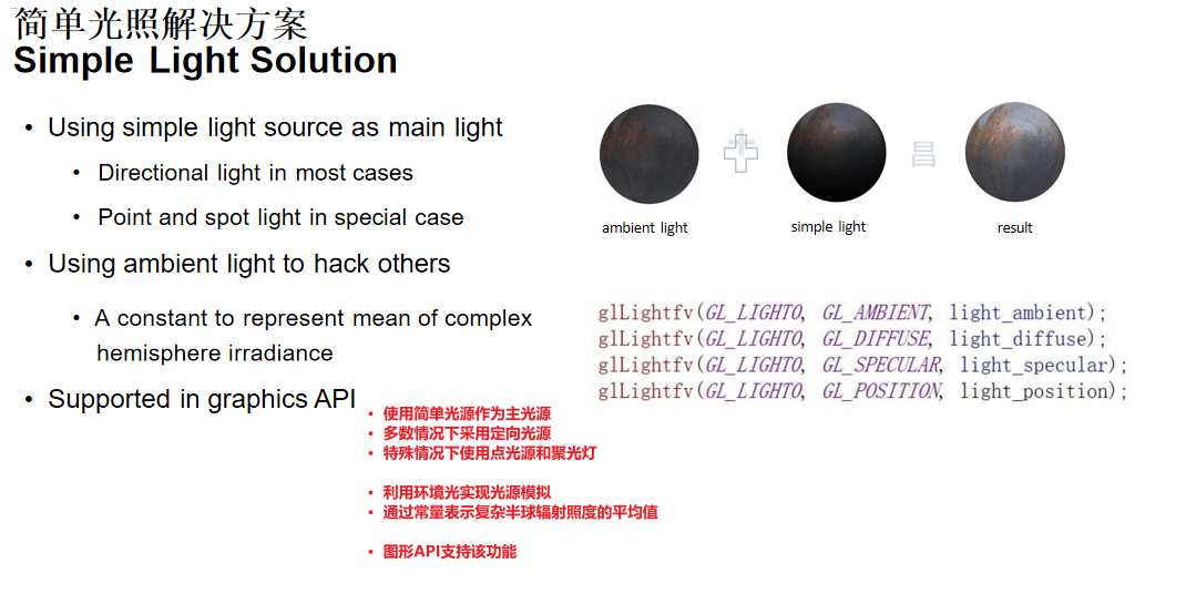 方向光因其计算简单且能模拟主要日光效果而被广泛使用;点光源和聚光灯则用于营造局部照明效果;而环境光则用一个常量来近似模拟复杂的全局间接光照,虽不精确但能有效避免阴影区域完全漆黑,是一种性能与效果间的实用权衡。