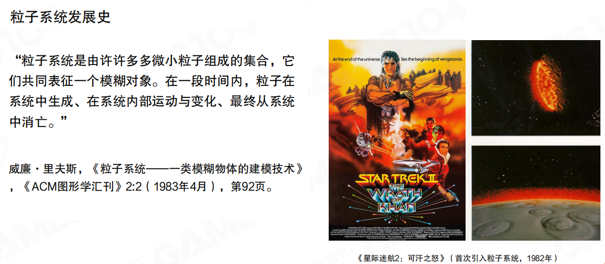 粒子系统最早起源于电影行业。1982年的《星际迷航2:可汗之怒》首次应用了这一概念,随后威廉·里夫斯(William Reeves)在1983年的论文中正式定义了粒子系统:一种用大量微小粒子来表示模糊物体的技术,这些粒子在系统中生成、移动、变化,最后消失。