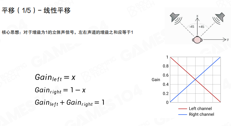 线性平移(Linear Panning)的核心思想:对于增益为1的立体声信号,左右声道的增益之和应等于1。