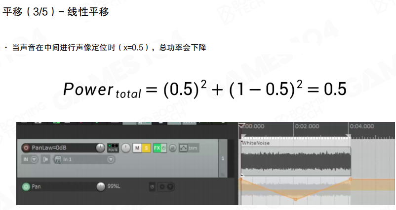 当声音在中间进行声像定位时(x=0.5),总功率会下降: