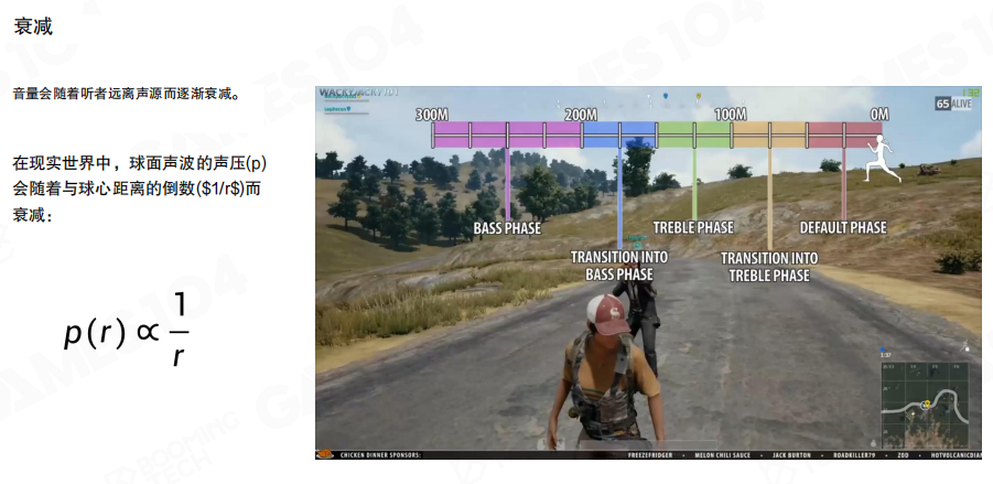 当声源远离听者时会出现衰减(Attenuation)现象,随着距离增加,听者能接收到的声音会不断减少。不仅接收到的音量会发生变化,距离也会对接收到的声音频率产生一定影响。