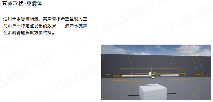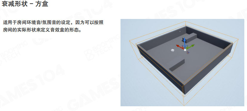 适用于房间环境音或氛围音的设定,可以按照房间的实际形状来定义音效盒的形态。当声音超出某个范围时,会迅速衰减。