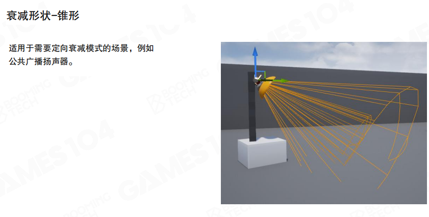 适用于需要定向衰减模式的场景,例如公共广播扬声器。高音喇叭输出的声音具有定向性,使用锥形衰减可以模拟这种效果。