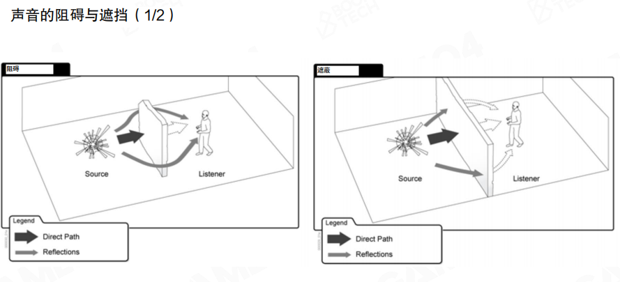 当声音的传播被部分阻挡时,直接路径会通过开口传递,同时也会通过反射和衍射到达听者。