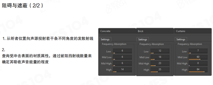 不同材质对不同频率的声音吸收率不同。例如混凝土、砖块、窗帘等材质,在不同频率段(低频、中低频、中高频、高频)的吸收系数存在显著差异。这种频率相关的吸收特性会影响声音的传播效果。