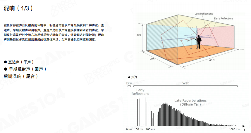 - 早期反射声(Early Reflections,Echo):声音经过几次反射后到达听者,通常有较短的延迟