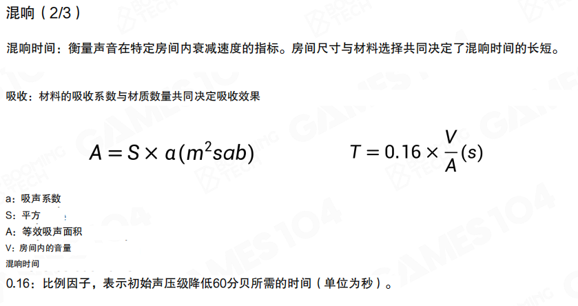 a:吸声系数S:面积A:等效吸声面积V:房间内的体积T:混响时间0.16:比例因子,表示初始声压级降低60分贝所需的时间(单位为秒)
