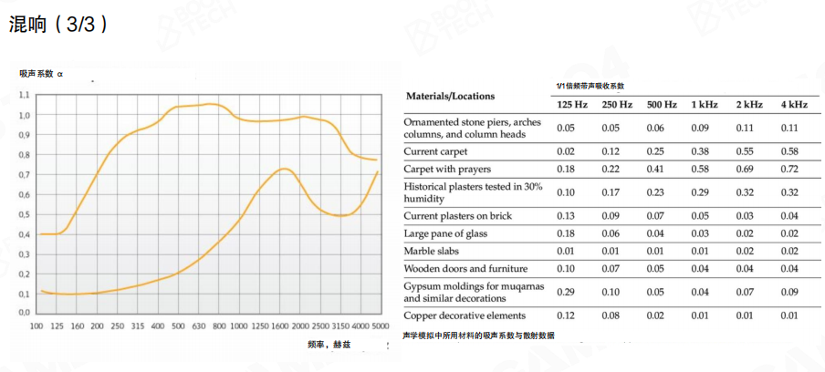 例如装饰石柱、地毯、石膏、玻璃、大理石、木门等材质,在125 Hz、250 Hz、500 Hz、1 kHz、2 kHz、4 kHz等频率段的吸收系数各不相同。这些数据用于声学模拟。