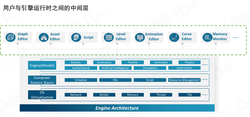 - 核心层:引擎运行时(运动、过场动画、粒子、动画、物理、音频、人工智能、模拟、破坏等)