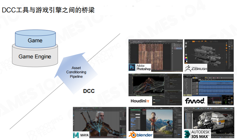 工具链连接游戏引擎与第三方DCC工具(Digital Content Creation,数字内容创作工具)。现代游戏开发需要使用大量第三方工具: