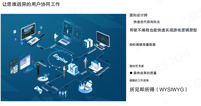 工具链的核心价值在于调和不同思维方式的人协同工作的平台。游戏团队通常包含三类不同背景的用户: