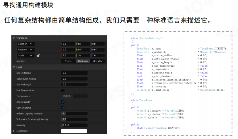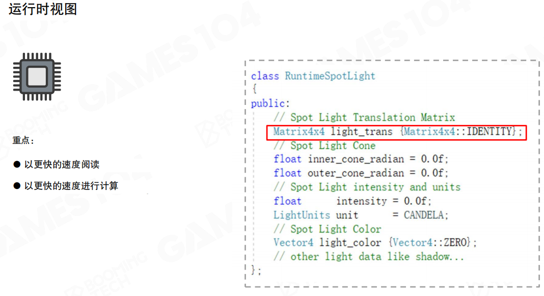 在内存中,数据结构定义都是为了各种数学变换,例如加减乘除、拷贝添加删除速度快为依据。例如RuntimeSpotLight类包含light_trans(Matrix4x4)、inner_cone_radian、outer_cone_radian、intensity、light_color等属性,这些属性都是为高效计算而设计的。