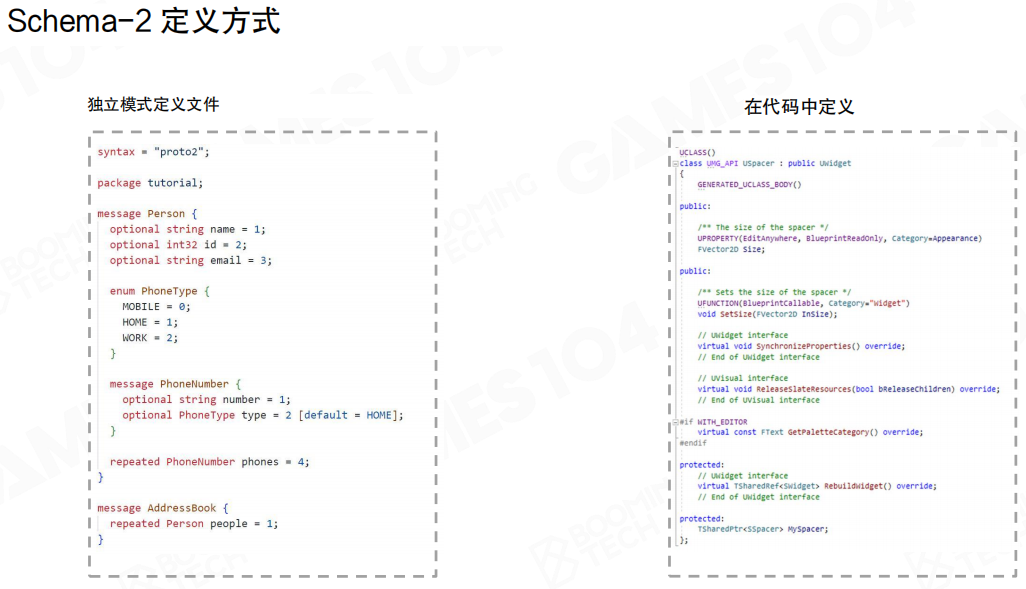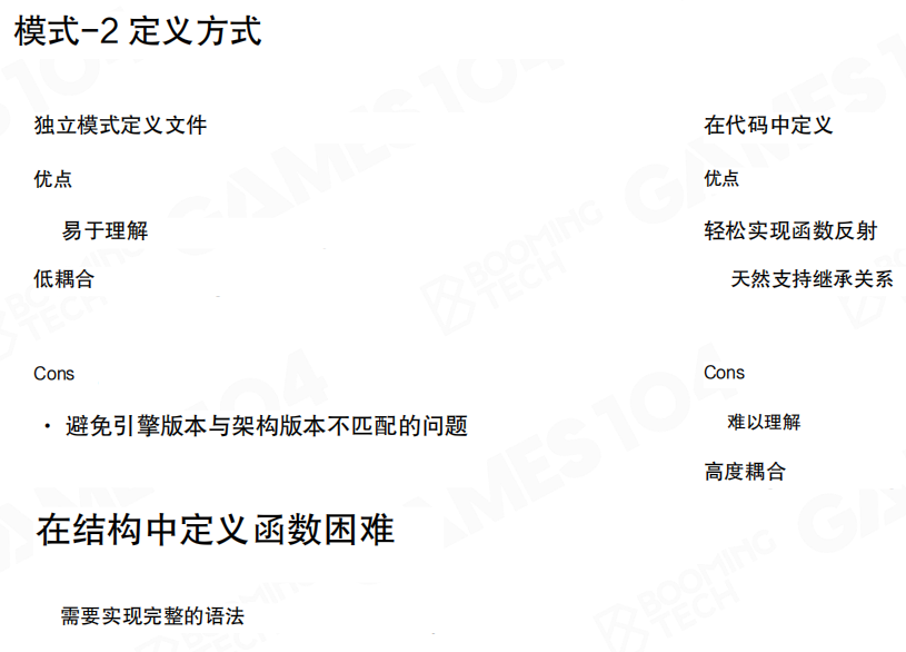 两种方法各有利弊,很难说哪个更好。独立文件方式需要代码生成器,容易出现版本不匹配问题。代码定义方式虽然复杂,但数据定义和引擎是高度匹配的,编译后整个系统就统一了,不太会出现版本不兼容。