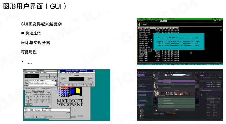 GUI正变得越来越复杂。从早期的MS-DOS文本界面,到Windows NT 3.1的图形界面,再到现代游戏引擎工具链的复杂界面,GUI的复杂度不断提升。现代工具链需要支持快速迭代、设计与实现分离、可复用性等特性。