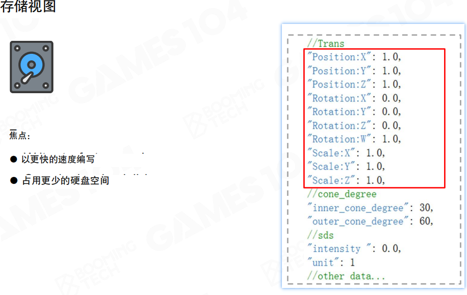 存储格式可能是JSON格式,包含Position、Rotation、Scale等字段,以及inner_cone_degree、outer_cone_degree、intensity、unit等属性。