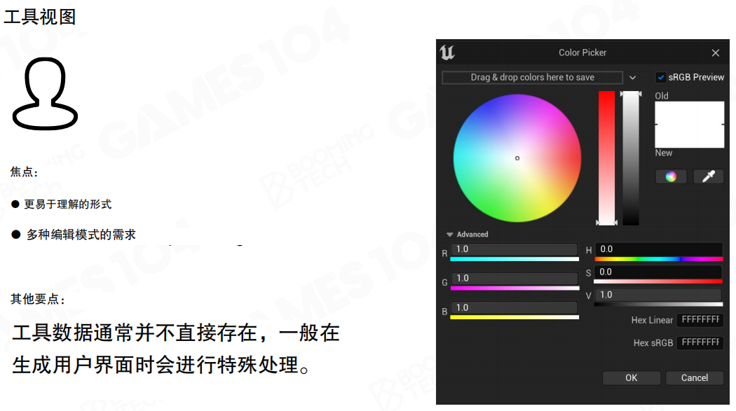 工具数据通常并不直接存在,一般在生成用户界面时会进行特殊处理。例如一个color,schema定义的是三个整数,但在工具里面会把它变成一个颜色选择器,用户可以看到非常符合人类理解的调色板。