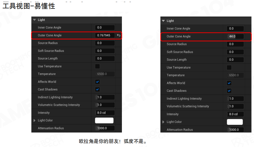 例如在设置一个引擎数据时,很多时候会设置角度。在引擎中一般用弧度,因为所有数学库的sin、cos、tan计算全部是基于弧度的。但跟艺术家讲输入一个3/4π,艺术家就懵了。这时工具中输出的全是欧拉角,比如270度、180度、360度、45度,这样人类就非常好理解。