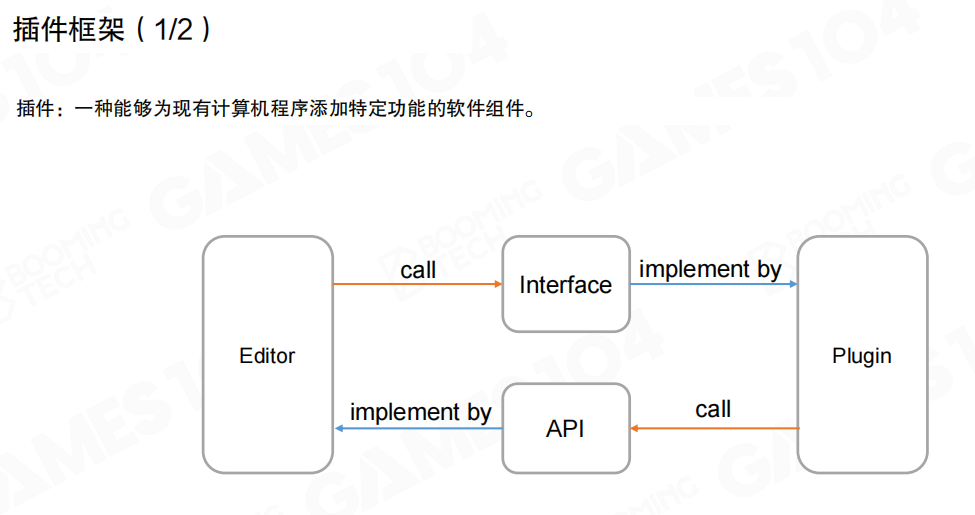 - 编辑器通过 接口(Interface)调用插件能力(插件实现接口)。