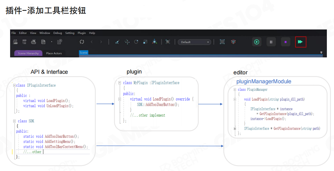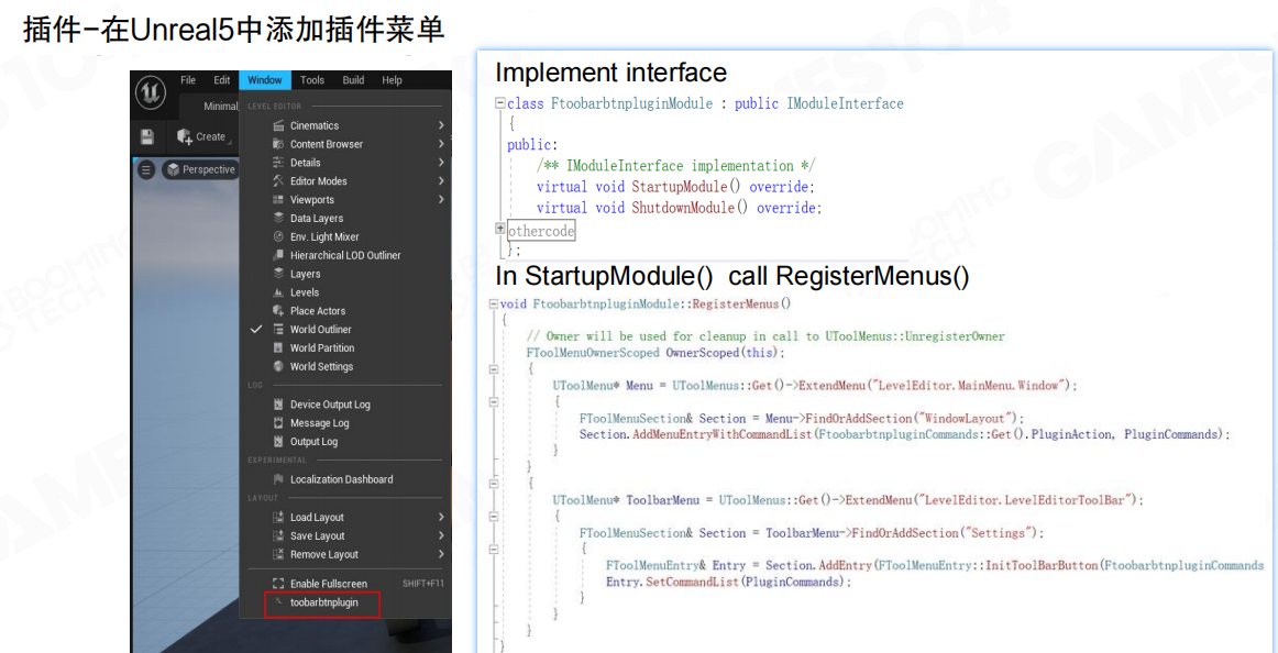 成熟商业引擎在插件接入上非常工程化。以 Unreal 为例,插件通常以模块(Module)的形式存在,实现统一的模块接口,并在启动阶段完成命令注册与菜单扩展。开发者在约定入口调用注册函数,即可把功能挂到编辑器主菜单或工具栏。
