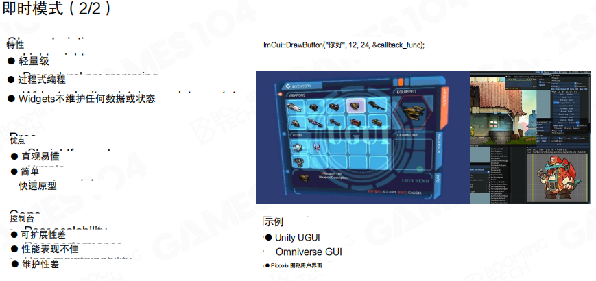 即时模式适用于简单工具或快速原型。例如Unity的IMGUI、Omniverse GUI、Piccolo图形用户界面等系统使用即时模式。