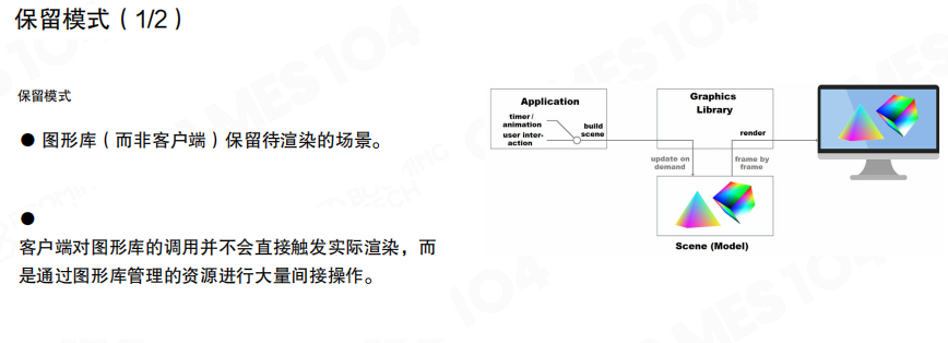 保留模式(Retained Mode)是现代游戏引擎工具链更常用的GUI实现方式。在保留模式中,图形库(而非客户端)保留待渲染的场景,客户端对图形库的调用并不会直接触发实际渲染,而是通过图形库管理的资源进行大量间接操作。