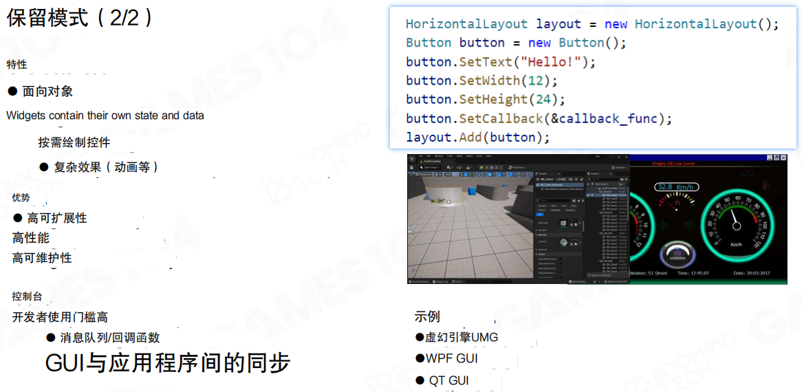 保留模式适用于复杂工具系统。例如虚幻引擎的UMG、WPF GUI、QT GUI等系统使用保留模式。