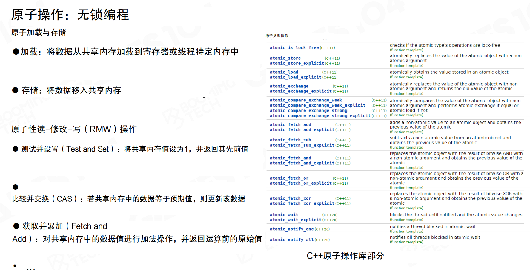 利用原子操作可以实现无锁的程序并行,从而避免死锁并提升运行效率。C++11提供了完整的原子操作库支持。
