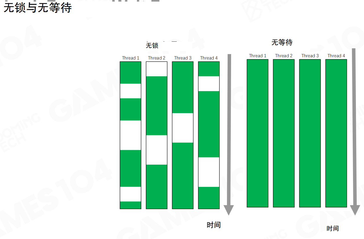 无等待(Wait-free):理论上可以保证所有线程持续执行,CPU利用率接近100%。但Wait-free编程非常复杂,需要严格的数学证明。对于游戏引擎开发,掌握Lock-free这一层通常已经足够。