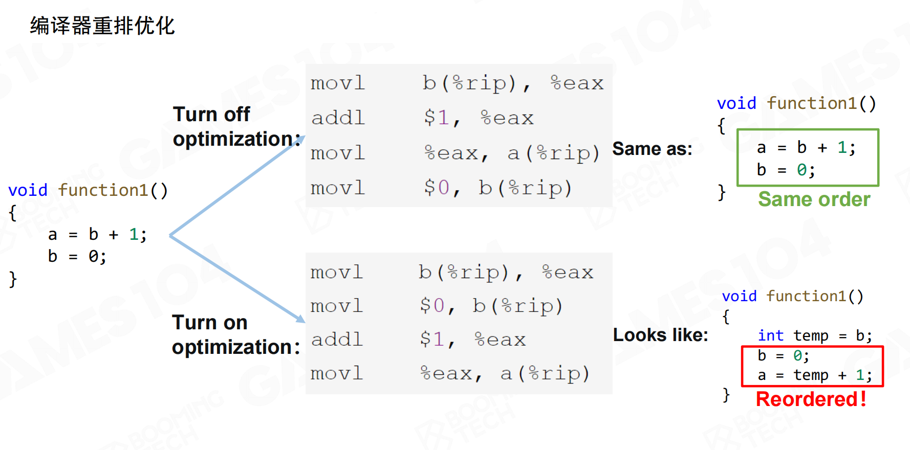 现代CPU采用乱序执行:CPU不会等待指令一条条执行,而是把一大段函数切成很多块,指令和数据同时在里面运行,这样速度才快。编译器也是按照这个原理优化的。
