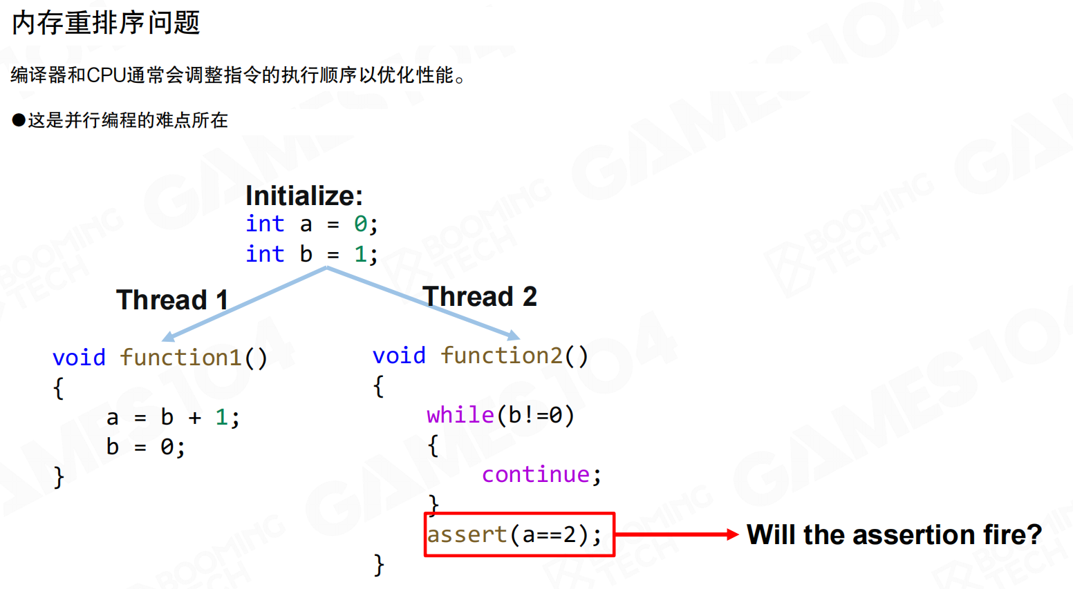 例如,线程1执行a = b + 1; b = 0;,线程2循环等待b != 0,然后断言a == 2。在单线程情况下,这个断言应该成立。但由于编译器和CPU的重排序,线程2可能在看到b == 0时,a还没有被正确设置,导致断言失败。