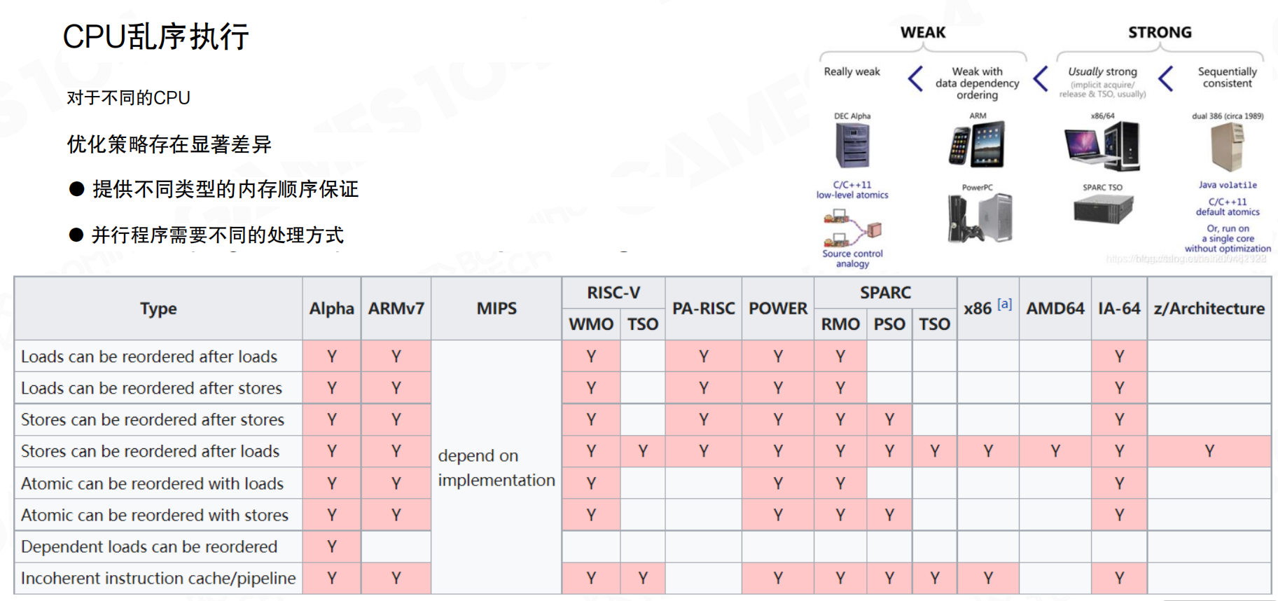 不同的CPU提供不同类型的内存顺序保证。从弱到强,内存模型可以分为:Really weak(如DEC Alpha)、Weak with data dependency ordering(如ARM、PowerPC)、Usually strong(如x86/64、SPARC TSO)、Sequentially consistent(如早期的386)。