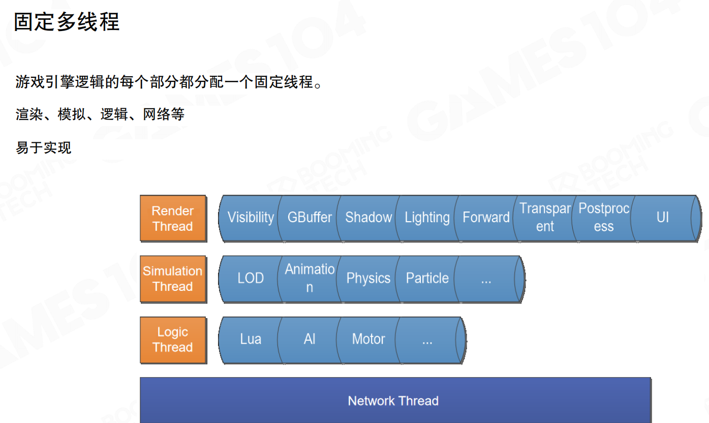 固定多线程(Fixed Multithreading)是最经典的并行架构方案。引擎的每个系统分配一个固定线程:渲染、模拟、逻辑、网络等各自拥有专属线程。每一帧开始时通过线程间通信交换数据,然后各自执行任务。