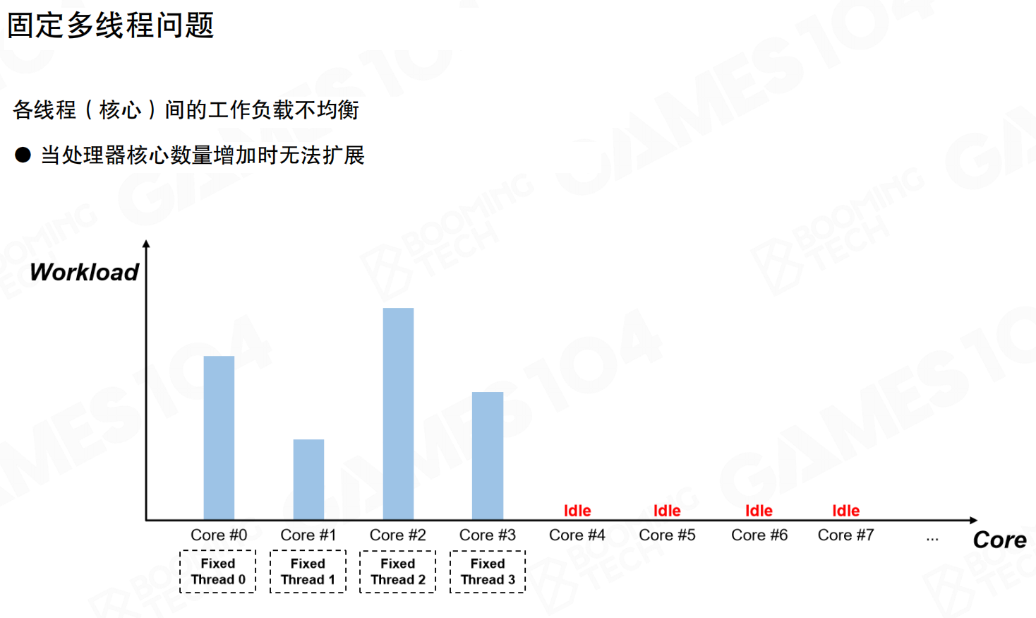 固定多线程的另一个问题是无法随处理器核心数量扩展。双核环境下,四个线程需要在两个核心上竞争,频繁的上下文切换带来性能损失。在多核环境下(如8核、16核),多余的核心只能闲置,造成计算资源浪费。这也是高配电脑上游戏卡顿但CPU占用率不高的原因之一。