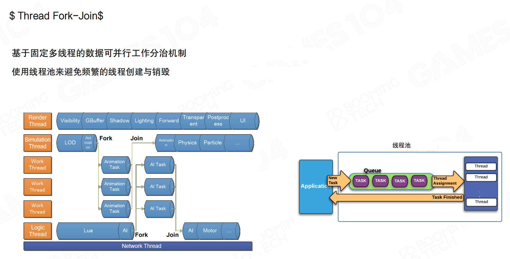 Fork-Join模式通过工作线程池实现并行计算。对于计算量大且一致性高的任务(如动画计算),固定线程通过Fork操作将任务分配到工作线程(Work Thread)并行执行,完成后再通过Join操作汇总结果。工作线程数量由CPU核心数决定,使用线程池避免频繁的线程创建与销毁。