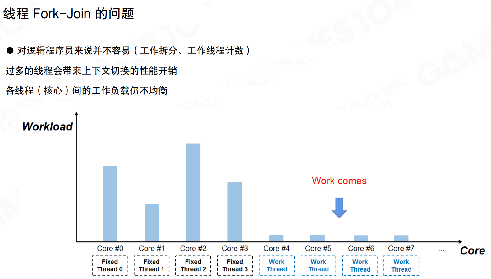 即使采用Fork-Join模式,新任务到来时工作负载分配仍难以平衡。许多任务无法事先预测负载,导致部分核心忙碌、部分核心空闲。