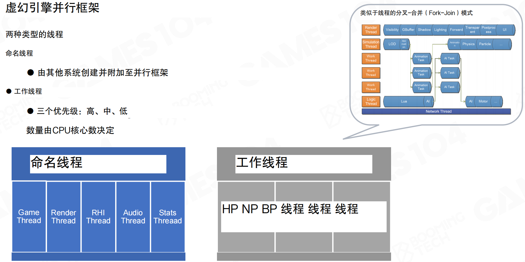 虚幻引擎采用Fork-Join架构,设计了两种线程类型:命名线程(Named Thread)和工作线程(Worker Thread)。命名线程由其他系统创建并附加至并行框架,对应引擎不同系统(Game Thread、Render Thread、RHI Thread、Audio Thread、Stats Thread等)。工作线程有三个优先级(高、中、低),数量由CPU核心数决定,用于执行具体计算任务。