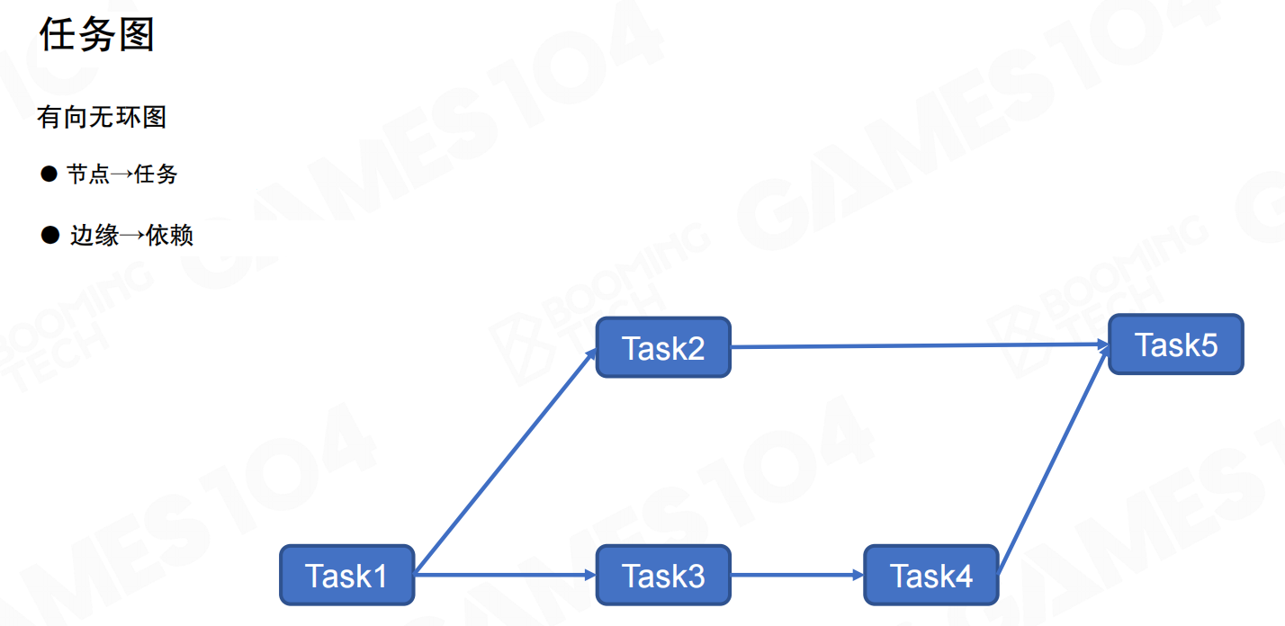 任务图(Task Graph)使用有向无环图(DAG)表示任务依赖关系。节点代表任务,边缘代表依赖。系统根据任务间的依赖关系决定执行顺序和可并行执行的任务。